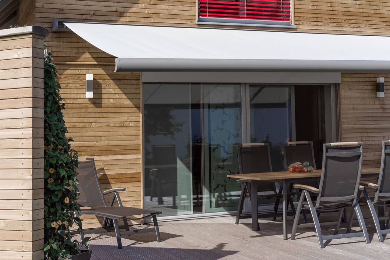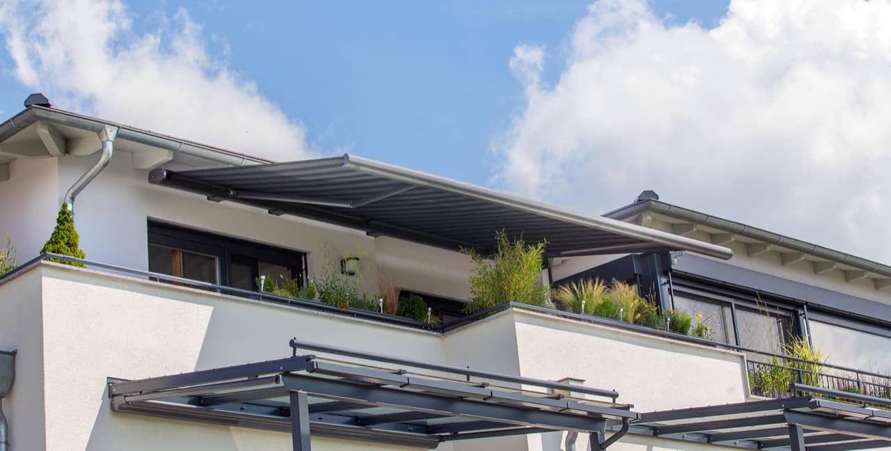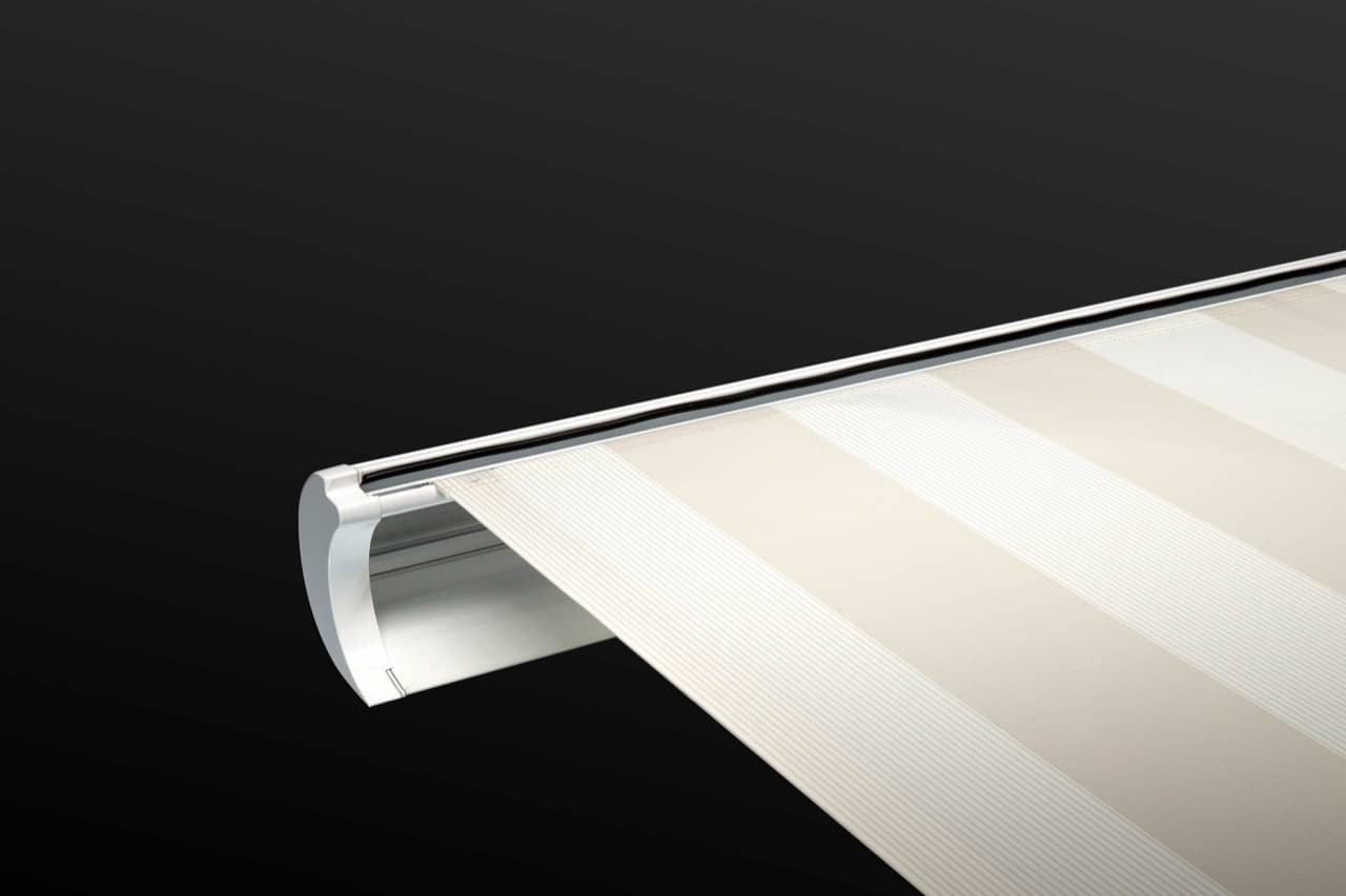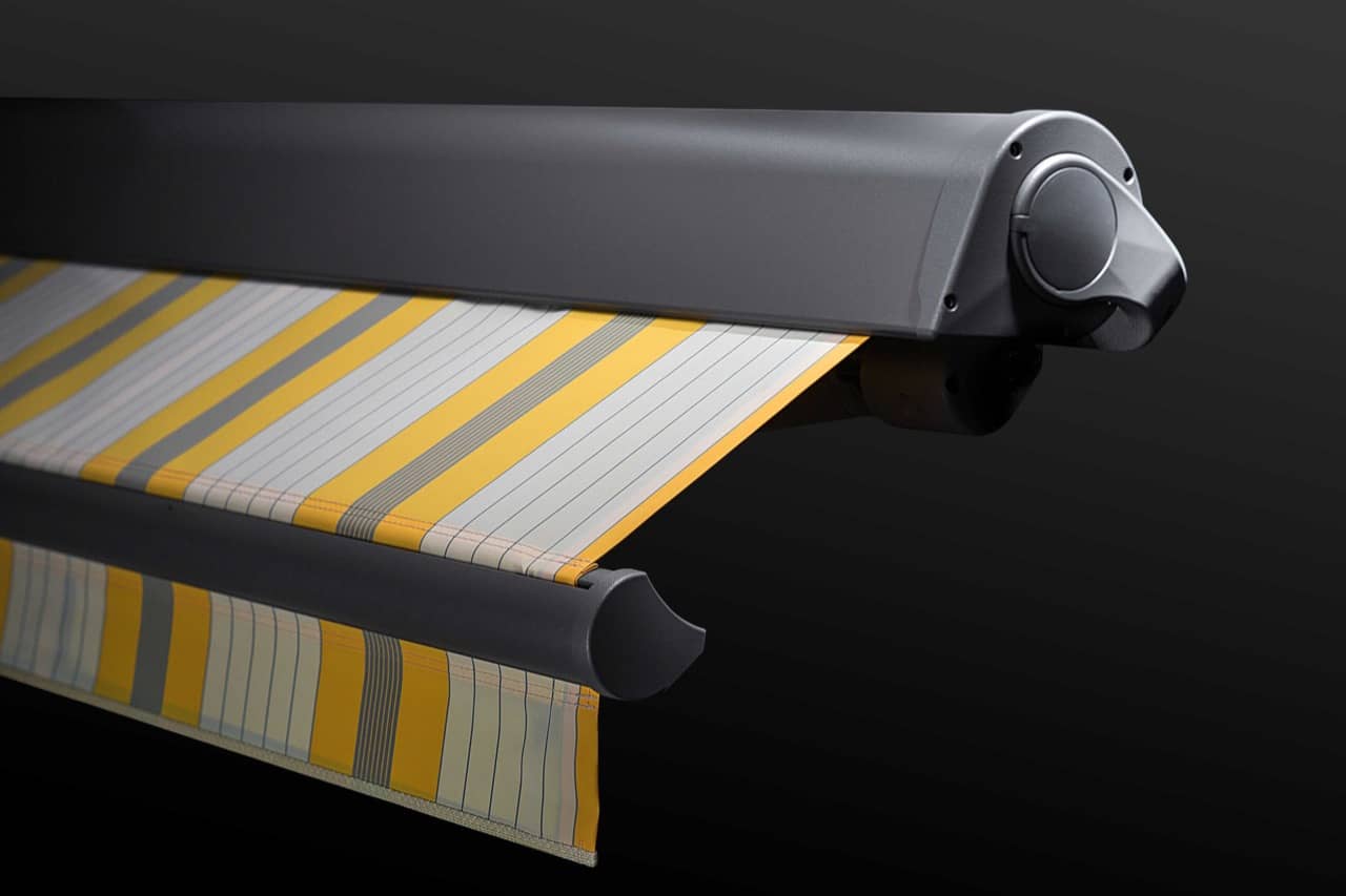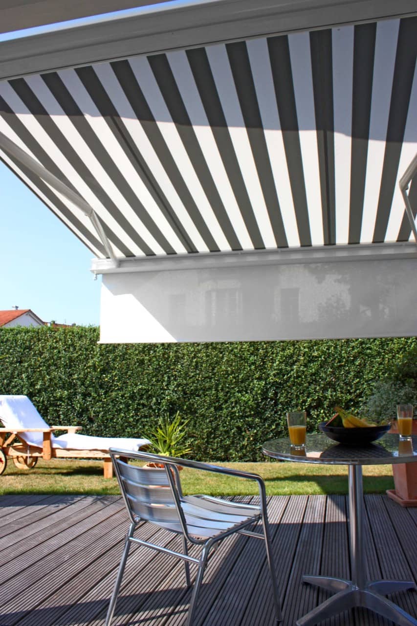 Die ERHARDT Q gibt es serienmäßig mit Motorausführung. Optisch hebt sie sich durch das moderne, eckige Bauhaus-Design von den anderen Markisen hervor.