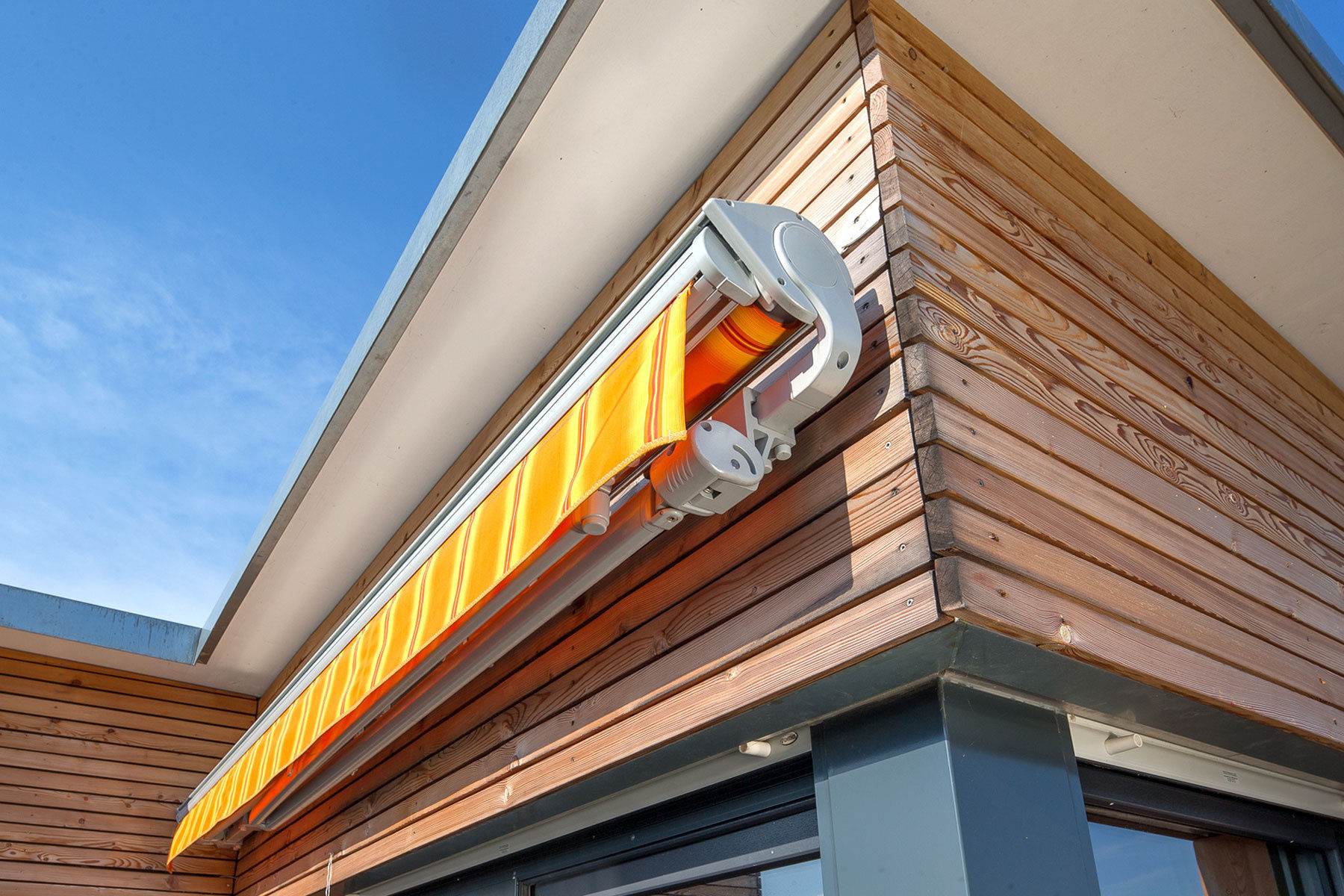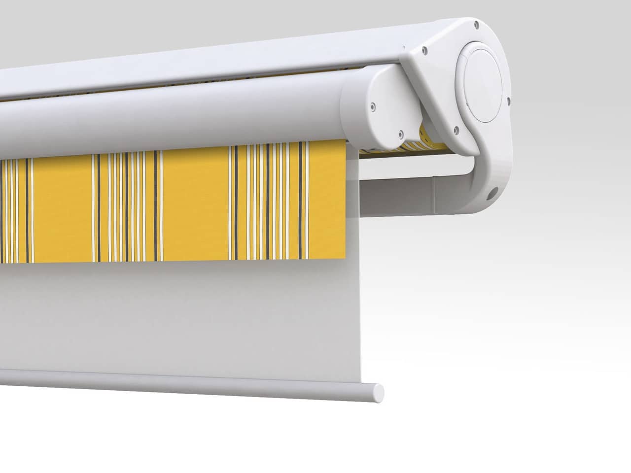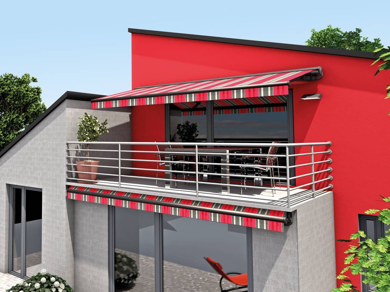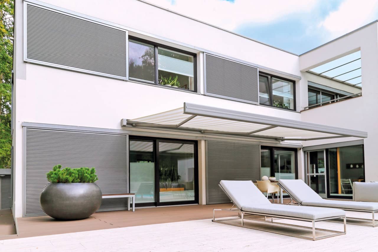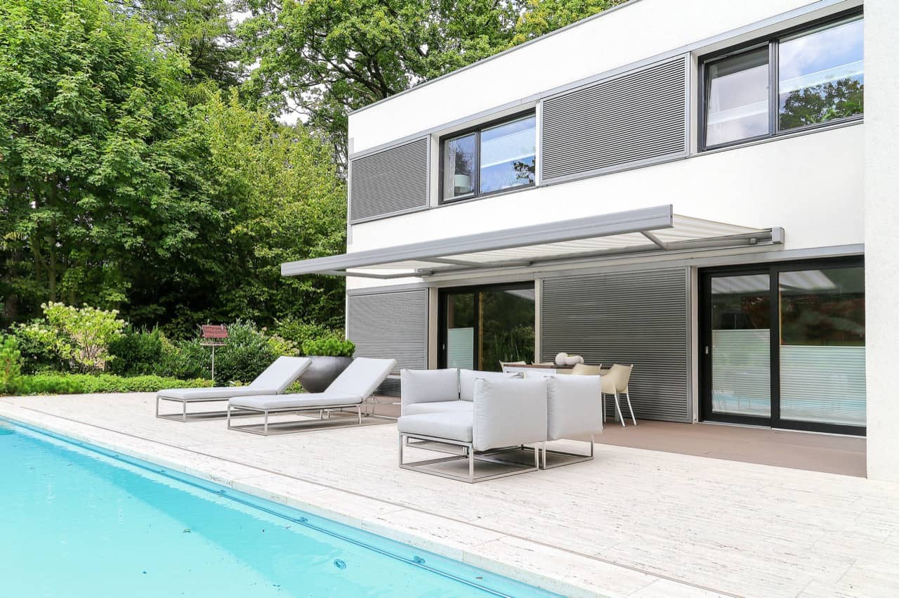 Die ERHARDT Q gibt es serienmäßig mit Motorausführung. Optisch hebt sie sich durch das moderne, eckige Bauhaus-Design von den anderen Markisen hervor.