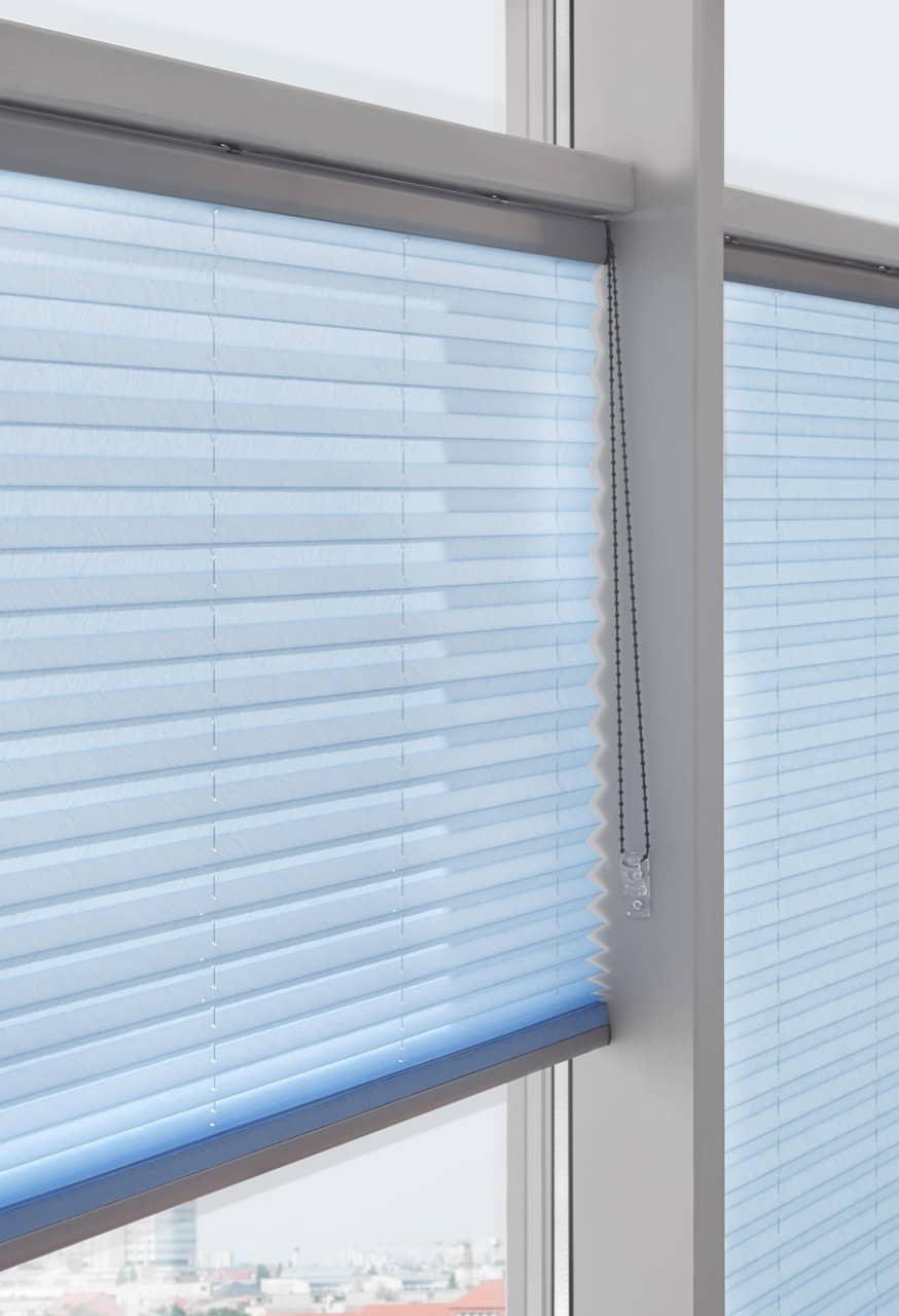 Erfal Plissees sind praktisch: Sie können freihängend oder verspannt montiert, und mit Griff; Zugschnur oder Kette bedient werden.
